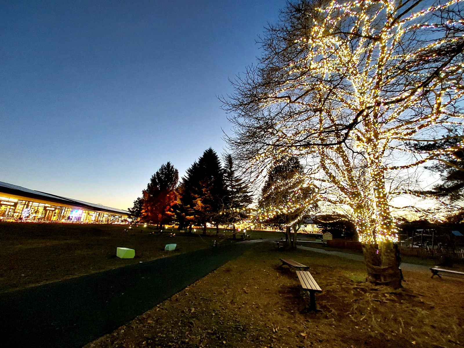 芝生のベンチに腰かけてたらイルミネーション点灯した